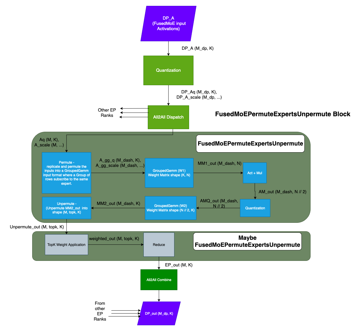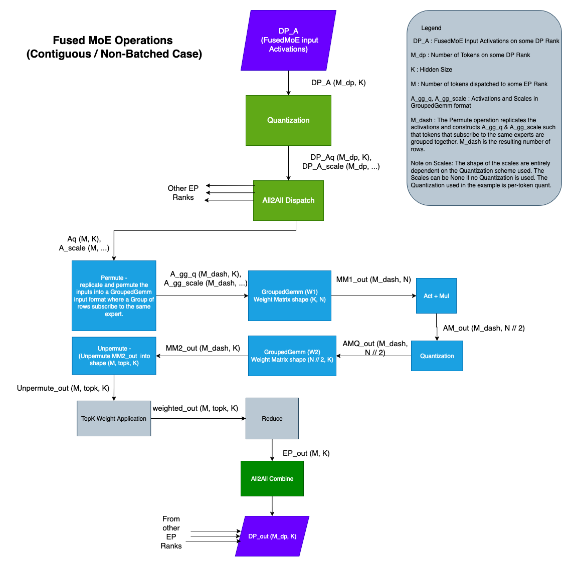 • In the Contiguous variant, the All2All Dispatch returns the activations as a contiguous tensor of shape (M, K) along with TopK Ids and TopK weights of shape (M, num_topk). Look at DeepEPHTPrepareAndFinalize for an example.