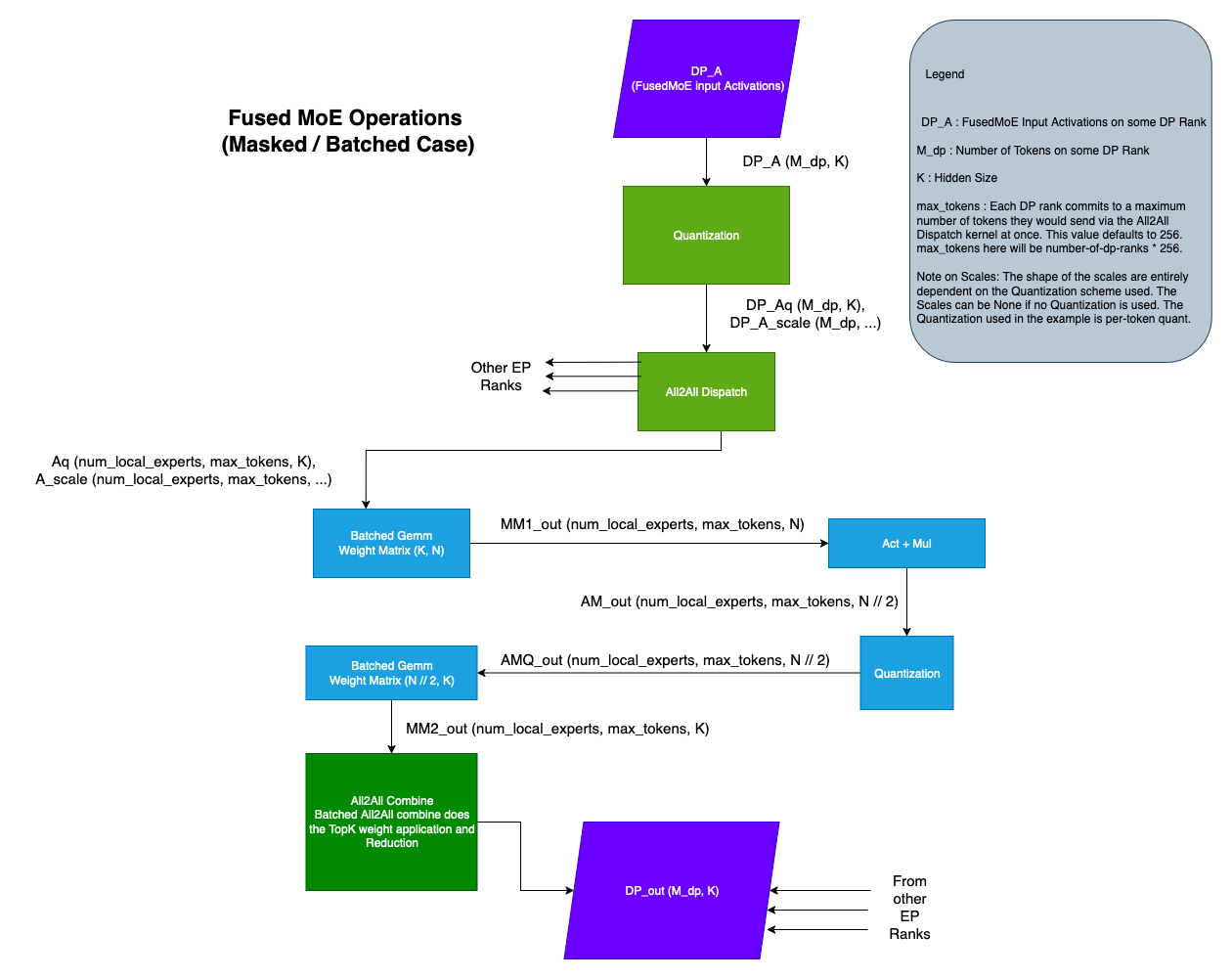 • In the Batched variant, the All2All Dispatch returns the activations as a tensor of shape (num_experts, max_tokens, K). Here, the activations/tokens that subscribe to the same expert are batched together. Note that not all entries of the tensor are valid. The activations tensor is typically accompanied by an expert_num_tokens tensor of size num_experts, where expert_num_tokens[i] indicates the number of valid tokens that subscribe to the ith expert. Look at DeepEPLLPrepareAndFinalize for an example.